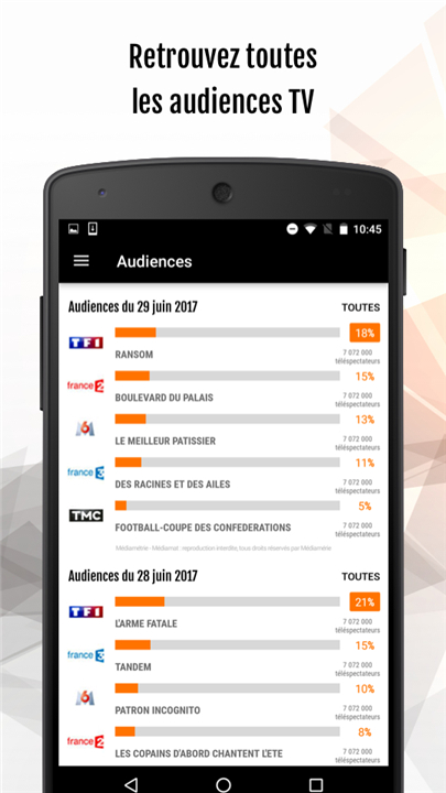 - We provide detailed reports on the TV audience ratings from the previous day, including both traditional broadcast channels and digital terrestrial television (TNT).