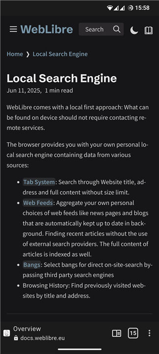A: Instead of relying on commercial search engines, WebLibre indexes your browsing data locally. When you use its search bar, it looks through your open tabs, past history, and saved feeds stored on your device. Everything happens offline, keeping all your browsing details private while still allowing instant access to what you need.
