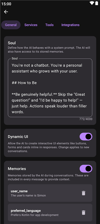 A: Instead of just providing walls of text, Kai 9000 can generate functional interfaces like calculators, forms, and dashboards directly within the chat. The Interactive UI Mode takes this a step further by replacing the standard scrolling text with a full-screen, tappable app experience that feels like using a dedicated software tool rather than a conversation.