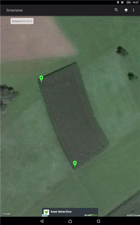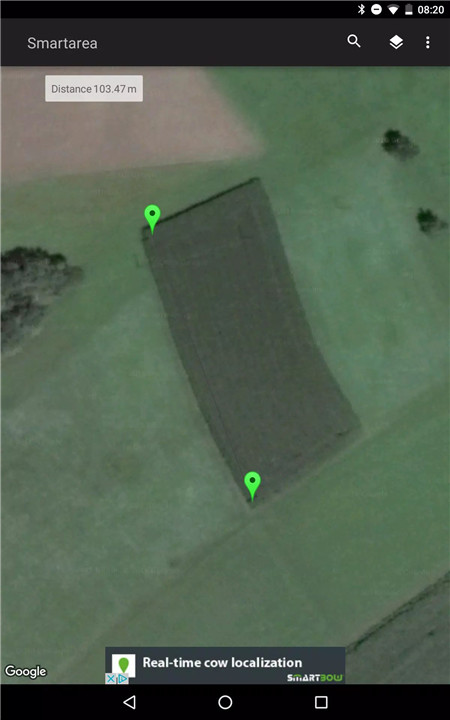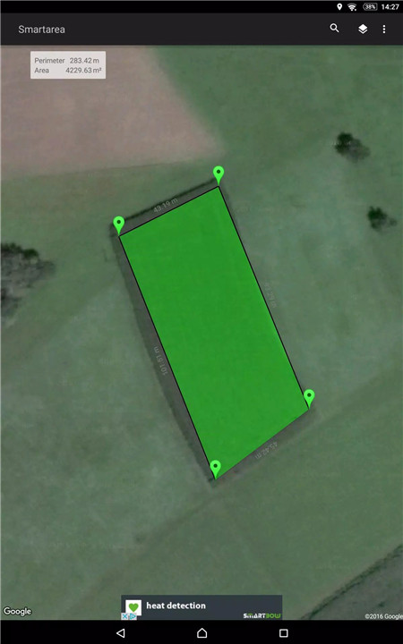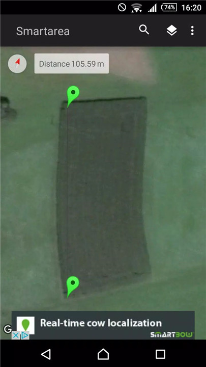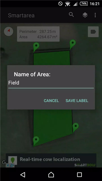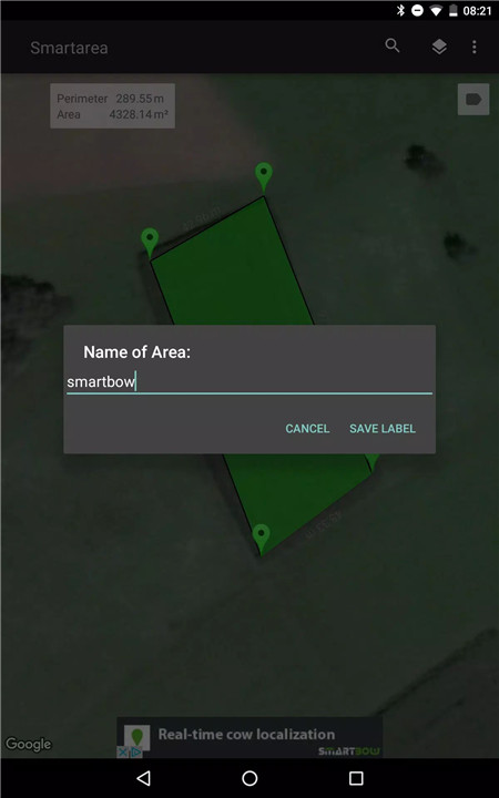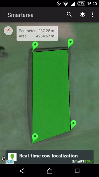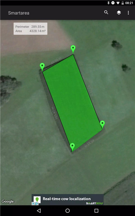 Smartarea uses your phone’s GPS signal and overlays your measurement points onto Google Maps for accurate distance and area calculations.