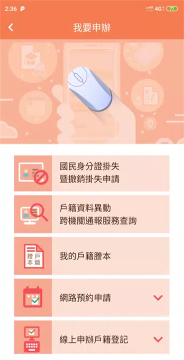 它是一款整合户政和役政服务的应用,提供线上办理户籍、身份证挂失、役男体检进度查询等功能。