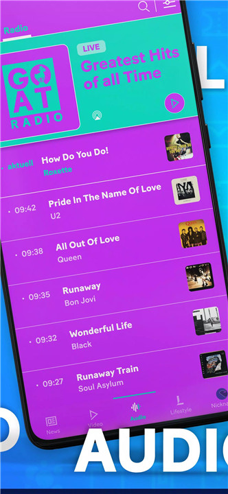 Listen to Swiss GOAT Radio, which plays the best pop rock hits from the 80s and other popular tracks. The app integrates audio entertainment alongside news to keep users engaged throughout the day.