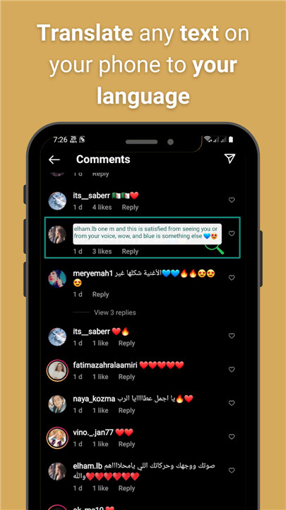 With the chat translation feature, you can easily convert incoming text messages in foreign languages to your preferred language. Additionally, it allows you to send messages to your friends in their native language. Thanks to our quick and precise translations, you can communicate in over 100 languages without a hitch.