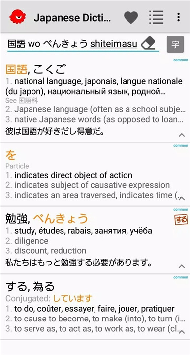 Takoboto dictionary还拥有强大的搜索功能!你可以根据需要,自由选择使用汉字、假名、罗马字或者拉丁字母进行单词查找。同时,完整的句子和共轭形式也能准确识别,你在学习也能更加高效!而对于汉字的搜索,只需一个点击,便可通过选择多个部首实现快速定位,学习也更加简单!
