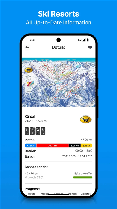 + Access detailed profiles for each ski resort, including piste maps, lift operations, and trail conditions.