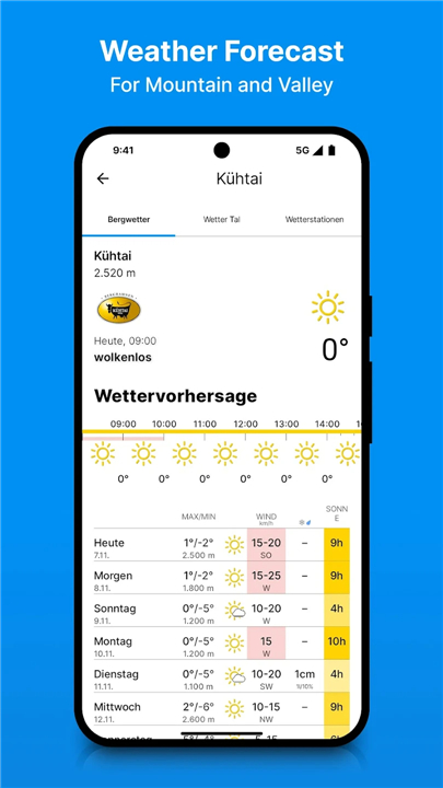 A: The app delivers a nine-day forecast for Alpine regions, complete with temperature trends, precipitation maps, wind predictions, and specialized snow forecast overlays. Interactive charts let you scroll through each day’s highs and lows, while detailed maps give you a visual sense of where and when snow will fall.