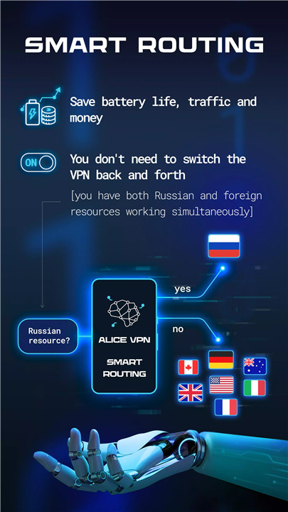 One of the most innovative features of Alice VPN is Smart Routing. This feature ensures that you don't have to turn your VPN on and off constantly. It enables you to access both local and international resources simultaneously. For example, you can browse local websites like Russian social networks, messengers, or streaming services directly, while simultaneously using the VPN for accessing foreign resources such as international social media, marketplaces, and banking. This optimized approach saves battery, data, and costs, making it highly efficient for daily use.
