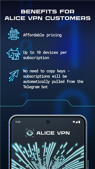 The paid version of Alice VPN provides automatic subscription management, support for up to 10 devices, faster speeds, resilience to blocks, and priority customer support, all at an affordable price.