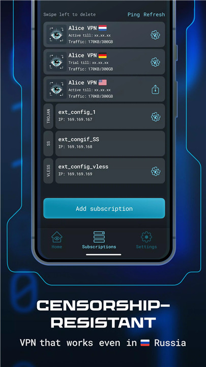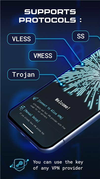 Alice VPN is compatible with several of the most popular VPN protocols, including XRAY, VLESS, VMESS, Shadowsocks, and Trojan. This broad support allows you to choose the best protocol for your needs, whether for maximum security or optimal speed. You can also load the keys from any VPN provider, including free services, or set up your own private VPN server, ensuring flexibility in how you connect to the internet.