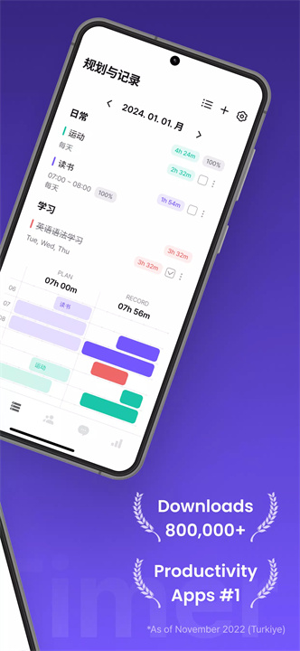 Dote Timer提供可视化的时间表,用户可以通过每日、每周计划来进行任务安排,清晰对比计划与实际时间的差异,帮助您优化时间使用。