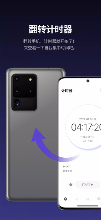通过将手机倒置,启动计时器并确保专注。触摸手机时计时器会自动暂停,从而避免手机带来的干扰,帮助用户集中精力。