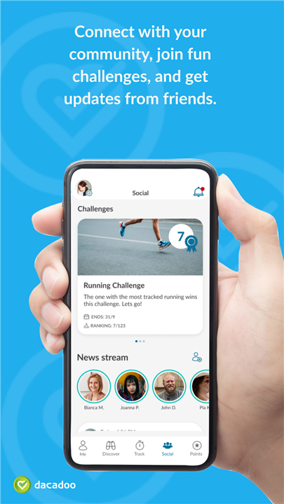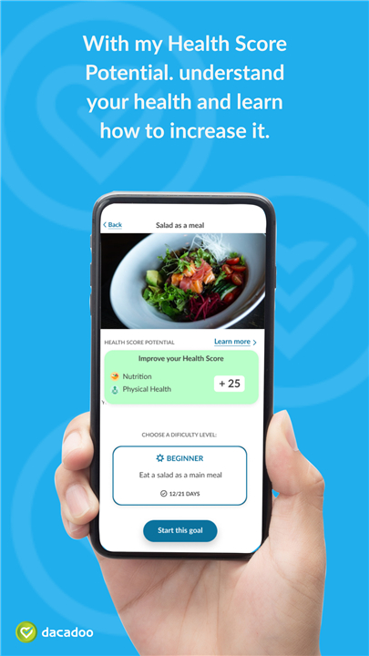 • dacadoo is built to motivate and inspire healthier habits through personalization, gamification, artificial intelligence, and behavioral science.