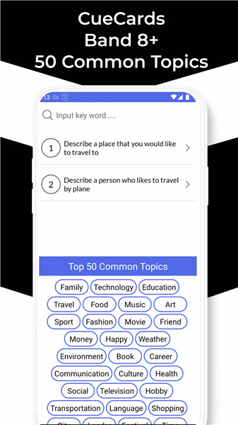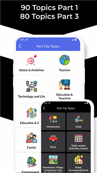 The app covers 90 topics for Speaking Part 1 and 80 topics for Speaking Part 3. These topics allow you to practice a wide range of conversational scenarios.