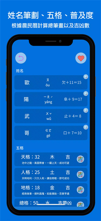 集成萌典和康熙字典,支持查询每个字的拼音、注音和详细释义,帮助用户理解名字的深层含义。