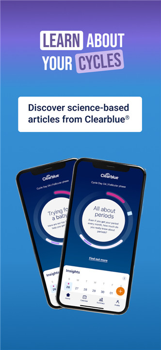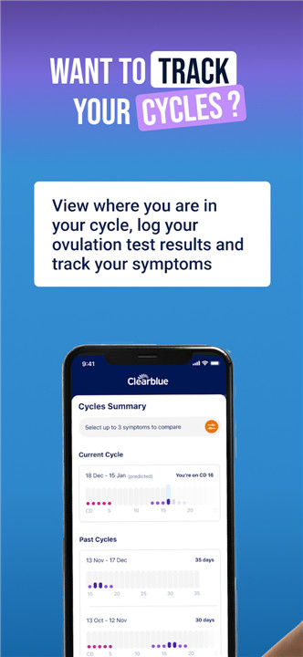 Discover your cycle status with the Clearblue® Period & Cycle Tracker app. You can easily log your periods, ovulation test results, and monitor your menstrual cycle symptoms. While it's optimized for use with Clearblue® Advanced Digital or Digital Ovulation Tests, you can still enjoy its features without any tests.
