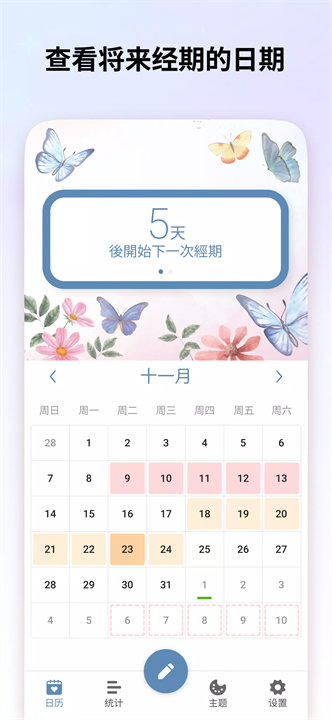 周期跟踪:记录月经、排卵期和生育窗口,帮助您预测下一个周期,避免错过重要日子。