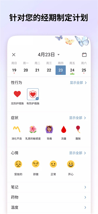 个人记录:可记录月经流量、症状、情绪、体温、体重、性生活及药物使用情况,全面了解自己的身体变化。