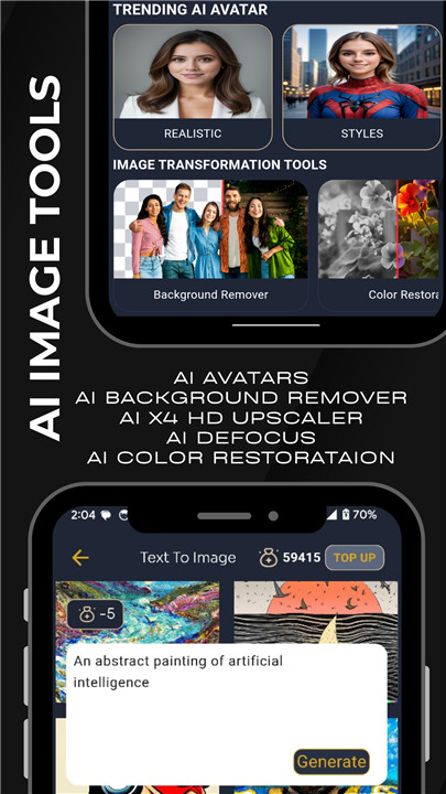 Our robust and intuitive app enables you to produce breathtaking AI images, design custom AI avatars, enhance existing photos using advanced AI techniques, and generate engaging AI text content—making it your go-to resource for all things AI in your creative projects.