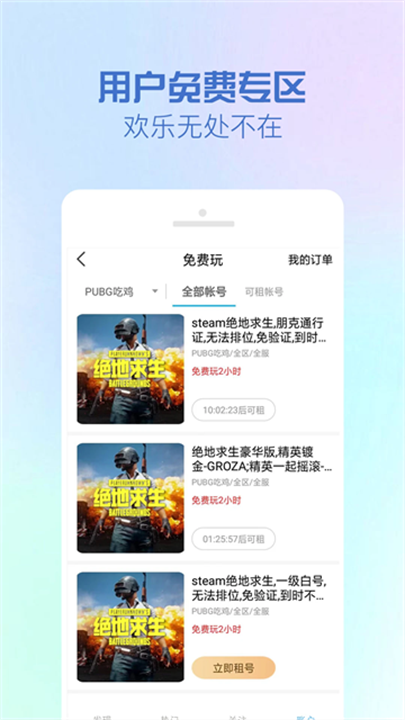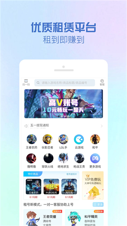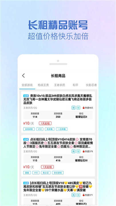 GG租号是一款专注于为玩家提供游戏账号租赁服务的应用,支持多个热门游戏账号的租用。玩家可以选择手游、端游或网游中的账号进行租赁,平台包括了王者荣耀、英雄联盟、绝地求生等经典游戏的账号租赁服务。