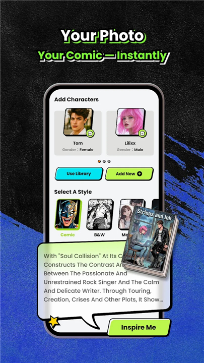 + Diverse Comic Styles: Choose from Manga, Manhwa, Webtoon, Superhero, Seinen, and more.