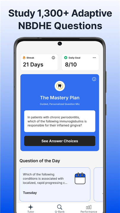 • Whether you’re just starting your NBDHE prep or refining your skills, our app adapts to your journey.