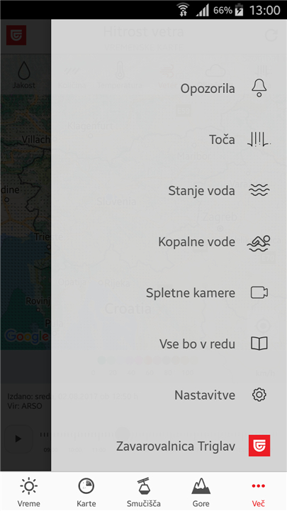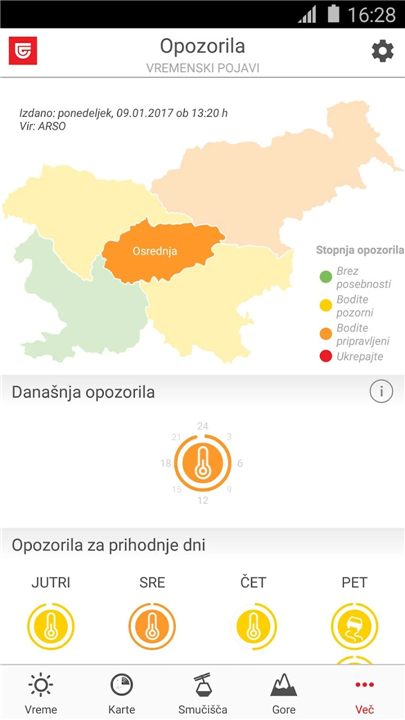 • Real-time notifications about dangerous or extreme weather events issued by ARSO.