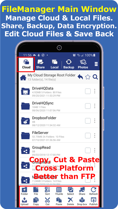 Manage Cloud/Local Files; Cloud Storage, Sharing, Backup, FTP; Edit Cloud Files Download the latest version of Cloud File Manager to enjoy new features and updates immediately!