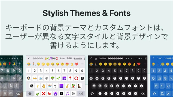 Switch effortlessly between English and Japanese modes with the touch of a button, while enjoying the convenience of emoji access directly from the keyboard interface. Customize your experience with a variety of color themes to suit your style. Choose from 21 color combinations.