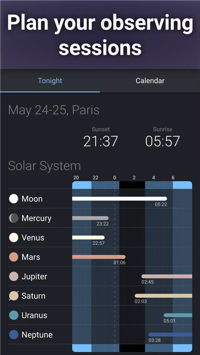 ✓ Astronomical events: Stay informed about upcoming celestial events, such as meteor showers, eclipses, conjunctions, and planetary alignments, with real-time notifications and event tracking features.