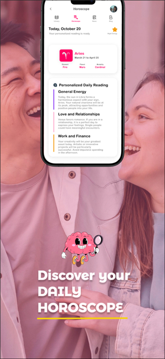 A: The app features an advanced artificial intelligence system that works alongside astrological wisdom to provide you with daily personalized horoscopes. This AI analyzes your birth chart against current planetary transits to offer you actionable advice and guidance tailored specifically to your life and relationships.