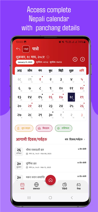 • Navigate your schedule with a comprehensive Nepali calendar featuring Panchanga details for auspicious timings.