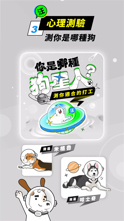 是的,你没看错!通过独特的打工心理测验,测出你灵魂住哪条狗,揭晓你适合的打工类型!比如你是“铲屎官型”狗狗,适合做宠物店助理,还是“高冷型”狗狗,适合单纯高效的网路工作?