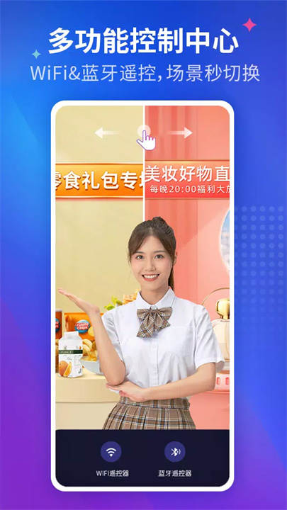 采用WiFi和蓝牙遥控器,避免传统手指触控,让你一人也能轻松控制直播背景和音量。