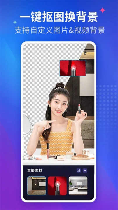 无需复杂的设备或高额背景定制,轻松抠图,快速切换直播背景,让直播间整洁专业。