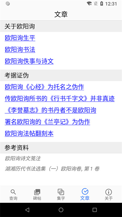 应用不仅整理了欧阳询的传世经典,还进行了托名伪作的考证,确保用户获取的信息准确可靠。