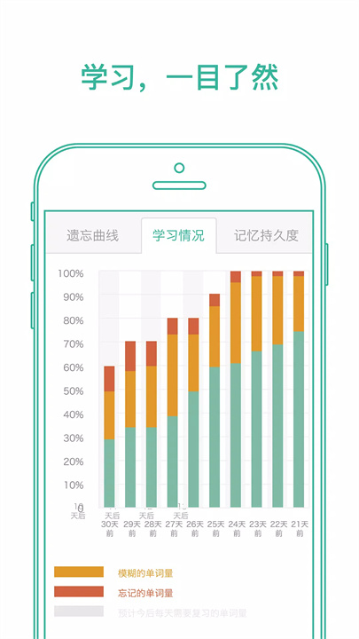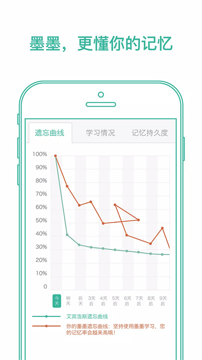 墨墨提供图表统计功能,显示你每日复习情况、遗忘曲线和记忆持久度。