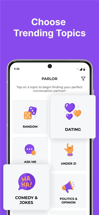 A: Getting started on Parlor is simple: download the app, sign up with your email or social account, and select the topics that excite you. Once you’ve chosen your interests, Parlor’s intelligent matchmaking system will connect you in seconds with someone else online who’s eager to talk about the same subject. There’s no lengthy profile setup or complicated permissions—just tap, match, and talk.