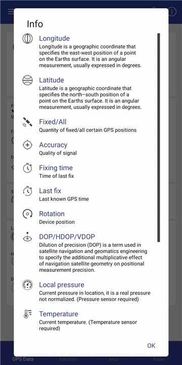 List of GPS Satellites: View the number of satellites your device is connecting to and their PRNs (pseudo-random noise codes). More satellites typically mean better accuracy.