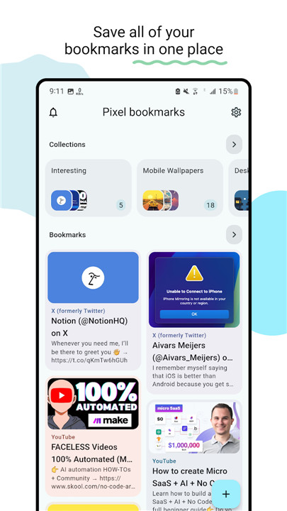Pixel Bookmarks lets you save and manage bookmarks from a variety of platforms—YouTube, Instagram, X (formerly Twitter), and many more—all in one convenient location!