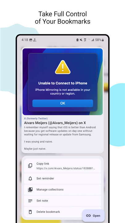 Easily share content from any app to Pixel Bookmarks, saving it without the hassle of switching apps—it's as simple as that!