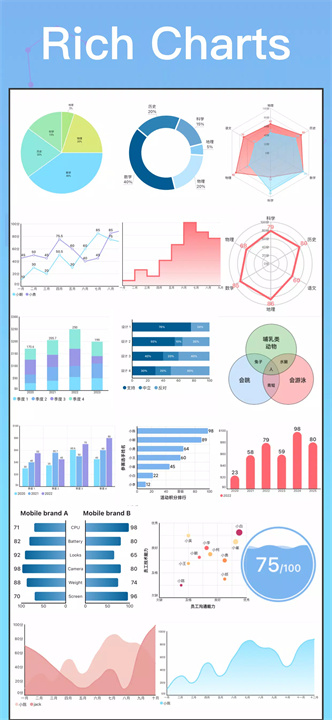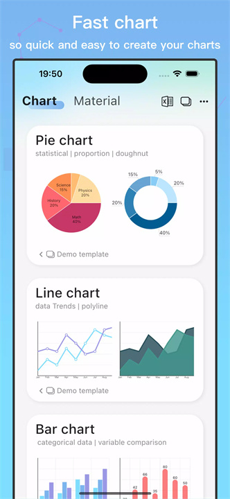 [快制图表]是一款高效便捷的图表制作应用,旨在帮助用户快速生成各种图表并导出为图片。支持多种常见图表类型,包括饼图、折线图、柱状图、雷达图等,用户可以轻松创建清晰直观的数据展示。同时,应用还提供丰富的素材选择,如进度条、金字塔和维恩图,满足多样化需求。丰富图表类型,让数据更生动!