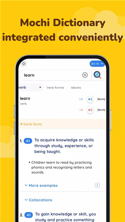 Utilize the built-in dictionary feature for quick vocabulary lookup, providing comprehensive information including word type, phonetics, audio, meanings, and examples.