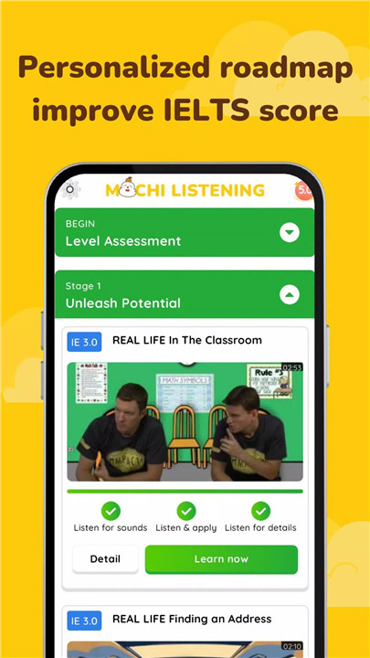 MochiVideo - English listening is an English listening app designed to enhance your IELTS listening skills with its unique 3-step intensive listening method and personalized roadmap.