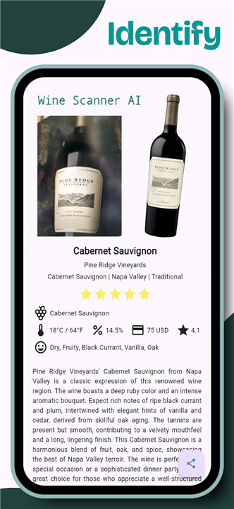 + Unveil the Story: Immediately access vital details like the name, winery, grape varietal, and region, bringing each bottle's history to life.