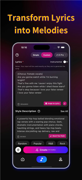 A: Absolutely! Our Lyric Studio Pro can generate professional-quality lyrics in a variety of styles—from rap to folk to classical—and you can fully customize the verses, rhymes, and themes. You can let AI do the heavy lifting or manually tweak the lines to make them truly your own.