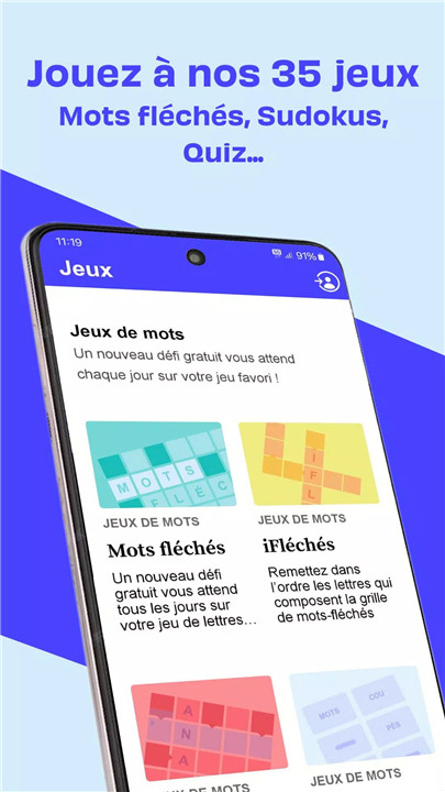 The app features 35 free games including Sudoku, Arrow Words, Puzzles, Crosswords, Kemaru, and 421.