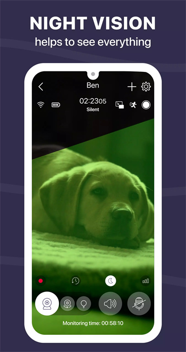 Buddy Dog Monitor 提供了高清的视频监控和双向音频功能,使您不仅能看到宠物的动态,还能听到它们的声音。特别的是,应用还配有夜视功能,让您在光线较暗的环境下依然能清楚观察宠物。