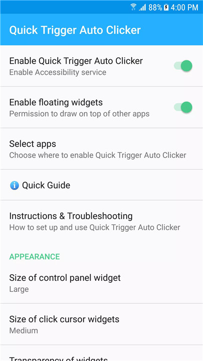 Floating Control Panel: Set up your auto clicking preferences through a floating control panel. Place click cursor widgets directly on your game's on-screen controls.