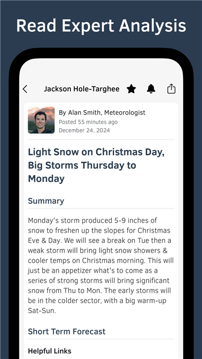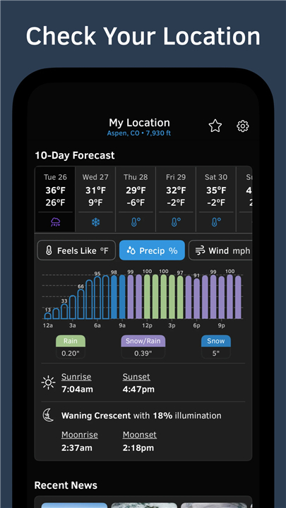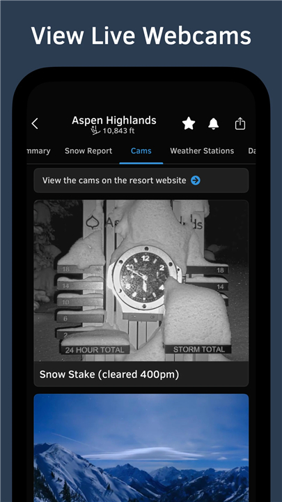 • Quickly check conditions for your favorite ski resorts, backcountry spots, or camping destinations.