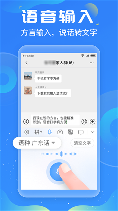 打开友友输入法,在键盘界面点击语音图标,授权语音权限后,按住语音键并说话,系统就会自动将语音转化为文字。